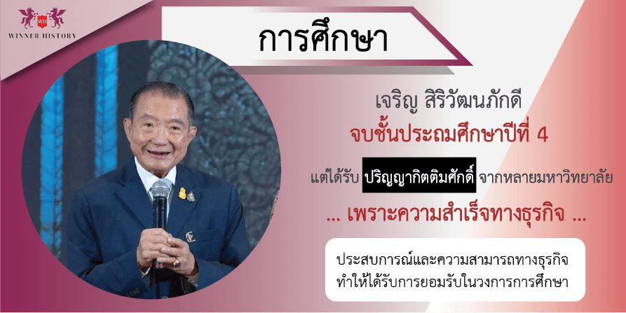 จาก timeline จะเห็นว่า แม้คุณเจริญ สิริวัฒนภักดี จะมีพื้นฐานการศึกษาในระบบค่อนข้างน้อย แต่ด้วยความสามารถในการบริหารธุรกิจจนประสบความสำเร็จสูงสุด และสร้างประโยชน์ต่อสังคมโดดเด่น ทำให้ได้รับปริญญากิตติมศักดิ์จากสถาบันต่างๆ มากกว่า 10 แห่ง เพื่อเป็นเกียรติแก่ความรู้ความสามารถของท่าน โดยส่วนใหญ่จะเป็นปริญญาทางด้านบริหารจัดการและธุรกิจที่สอดคล้องกับความเชี่ยวชาญของท่าน