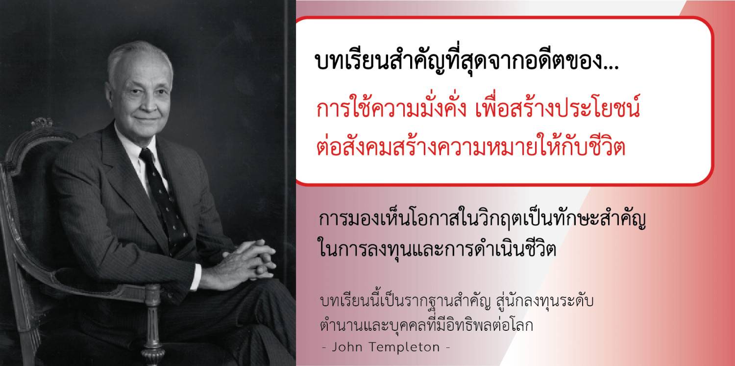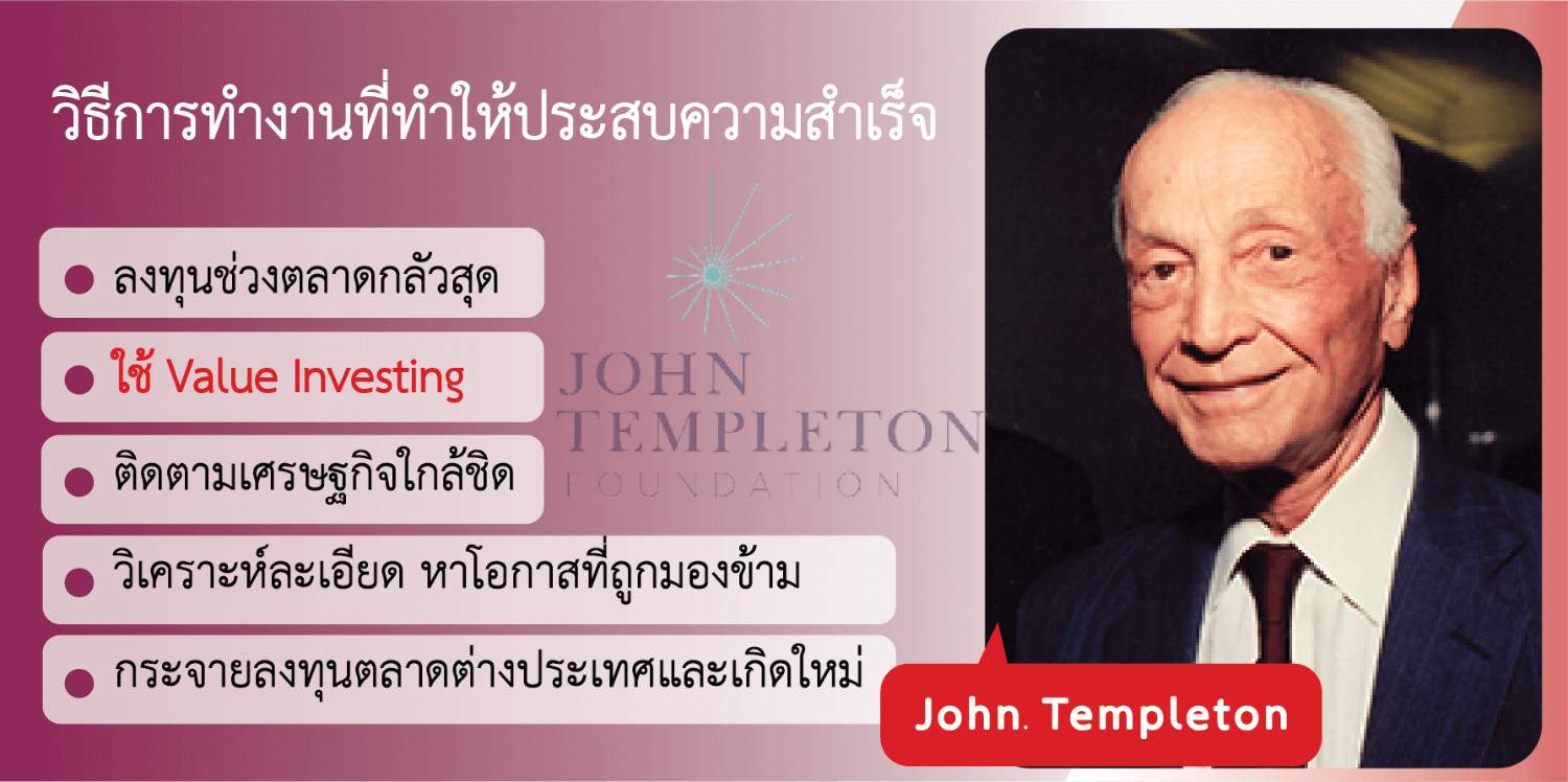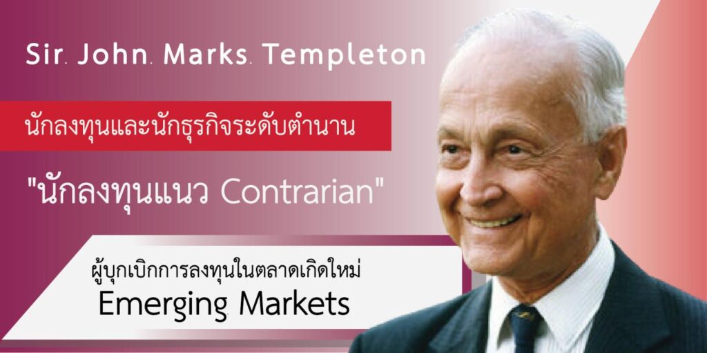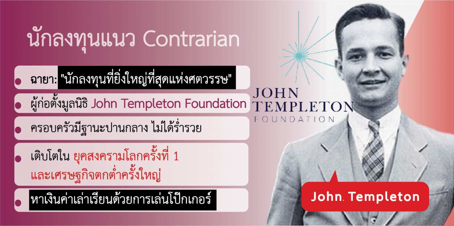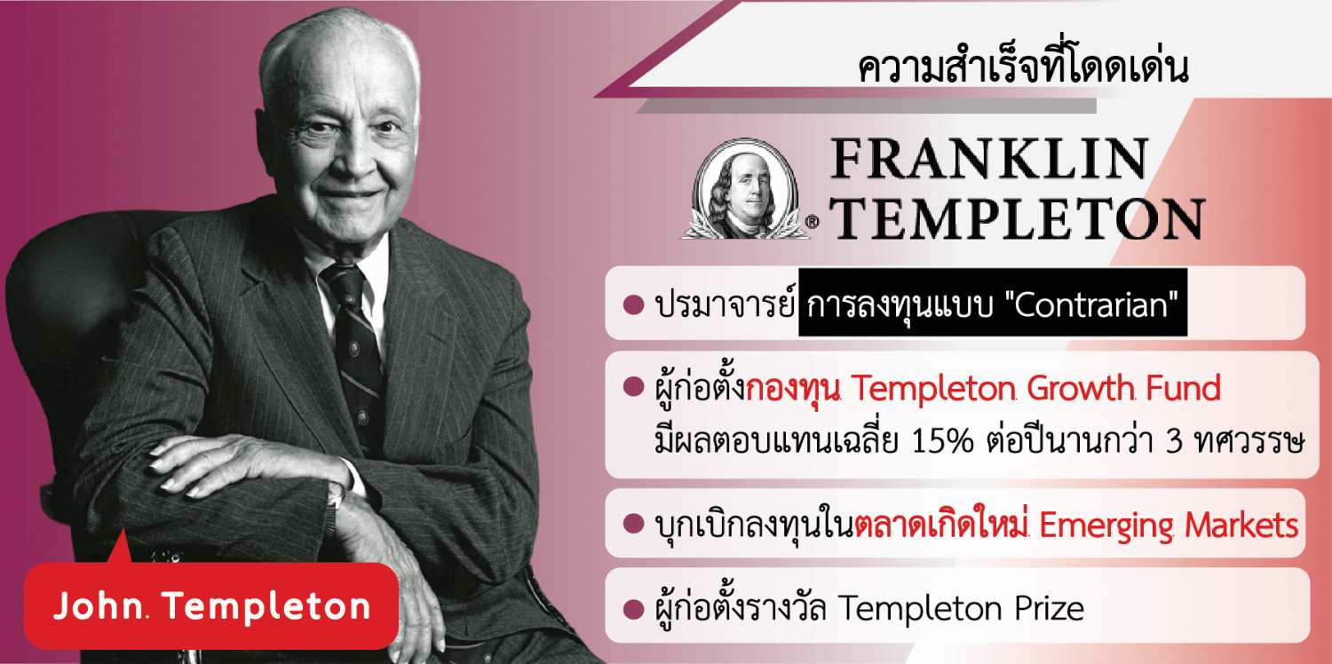 John Templeton คือ นักลงทุนและนักธุรกิจระดับตำนานที่มีแนวคิดการลงทุนแบบ “contrarian” อันโดดเด่น เขามองเห็นโอกาสในวิกฤต และกล้าลงทุนในช่วงเวลาที่คนอื่นกลัว จนประสบความสำเร็จอย่างยิ่งใหญ่ นอกจากนี้ เทมเพิลตันยังเป็นนักบริจาคและนักปรัชญาที่สนใจเชื่อมโยงวิทยาศาสตร์กับศาสนา จนได้รับการยกย่องเป็นบุคคลสำคัญของโลก