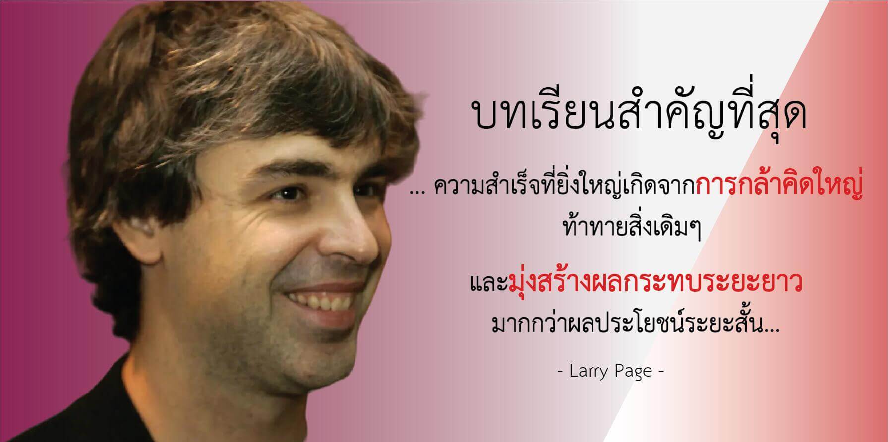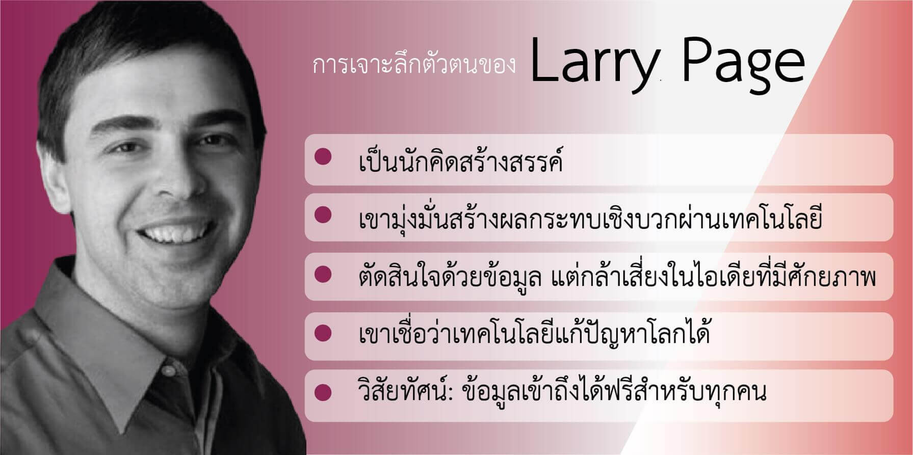 Larry Page เป็นตัวอย่างที่ดีของนักนวัตกรรมที่มีวิสัยทัศน์กว้างไกล เขาไม่เพียงแต่ปฏิวัติวิธีการค้นหาข้อมูลบนอินเทอร์เน็ต แต่ยังสร้างบริษัทที่มีอิทธิพลต่อชีวิตผู้คนทั่วโลก ความสำเร็จของเขาแสดงให้เห็นถึงพลังของความคิดสร้างสรรค์ ความกล้าที่จะท้าทายสถานะเดิม และความมุ่งมั่นที่จะสร้างผลกระทบเชิงบวกต่อสังคม
