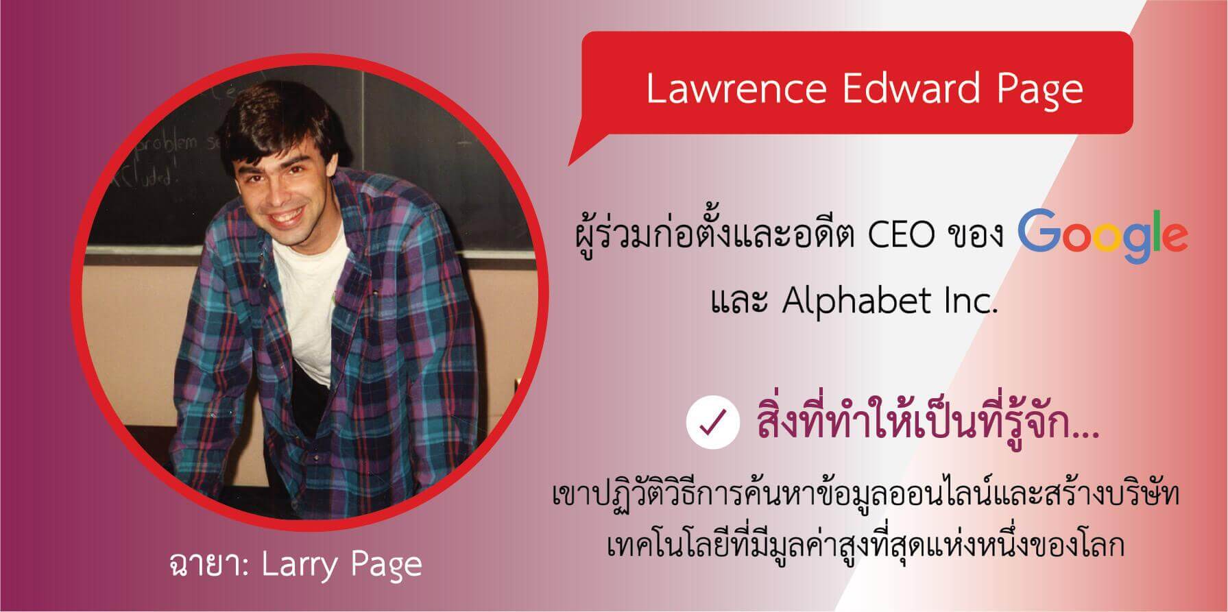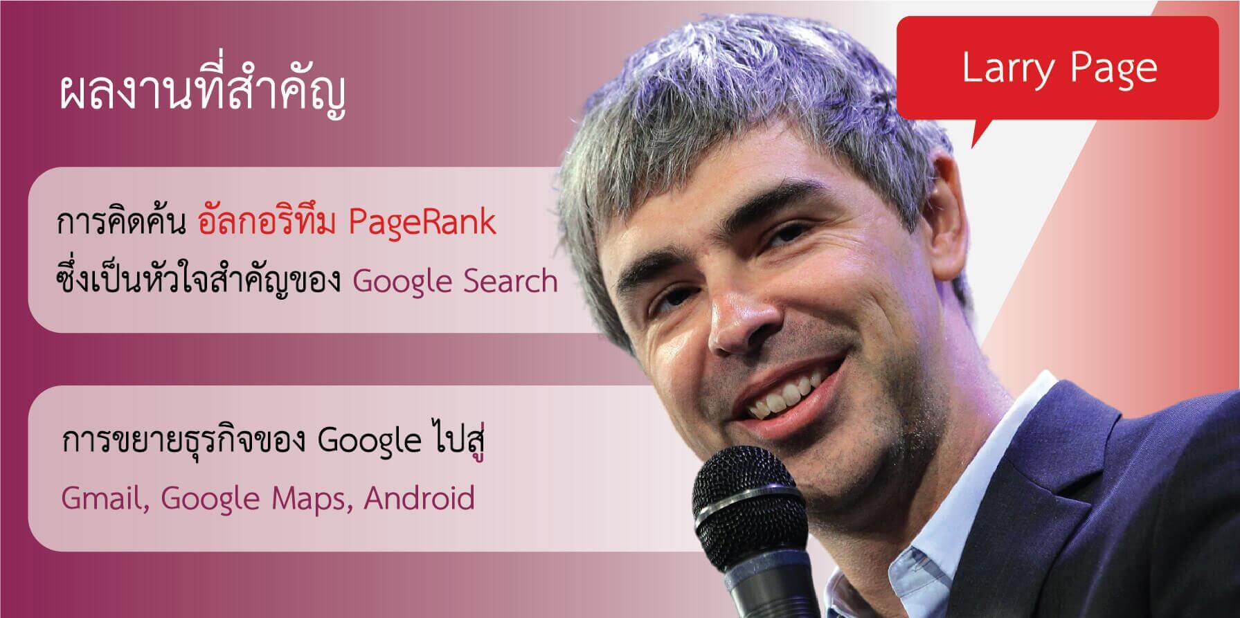 Lawrence Edward Page คือผู้ ร่วมก่อตั้งและอดีตประธานเจ้าหน้าที่บริหาร (CEO) ของ Google ซึ่งปัจจุบันเป็นบริษัทในเครือของ Alphabet Inc. เขาเป็นนักคอมพิวเตอร์ชาวอเมริกันและนักธุรกิจพันล้าน ที่มีบทบาทสำคัญในการพัฒนาเครื่องมือค้นหาที่ปฏิวัติวงการอินเทอร์เน็ต Page ร่วมก่อตั้ง Google กับ Sergey Brin ในปี 1998 ขณะเป็นนักศึกษาปริญญาเอกที่มหาวิทยาลัยสแตนฟอร์ด และมีส่วนสำคัญในการเติบโตของบริษัทจนกลายเป็นหนึ่งในบริษัทเทคโนโลยีที่ทรงอิทธิพลที่สุดในโลก ดังนี้