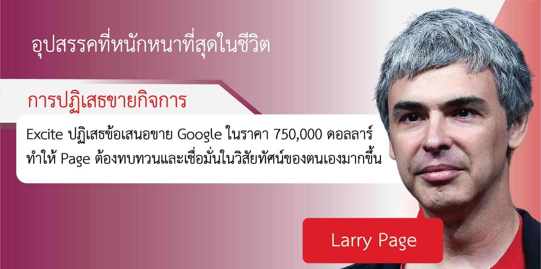 • Larry Page เคยเสนอขาย Google ให้กับ Excite ในราคาเพียง 750,000 ดอลลาร์ในช่วงเริ่มต้น แต่ถูกปฏิเสธ ซึ่งปัจจุบัน Google มีมูลค่าตลาดมากกว่า 1 ล้านล้านดอลลาร์