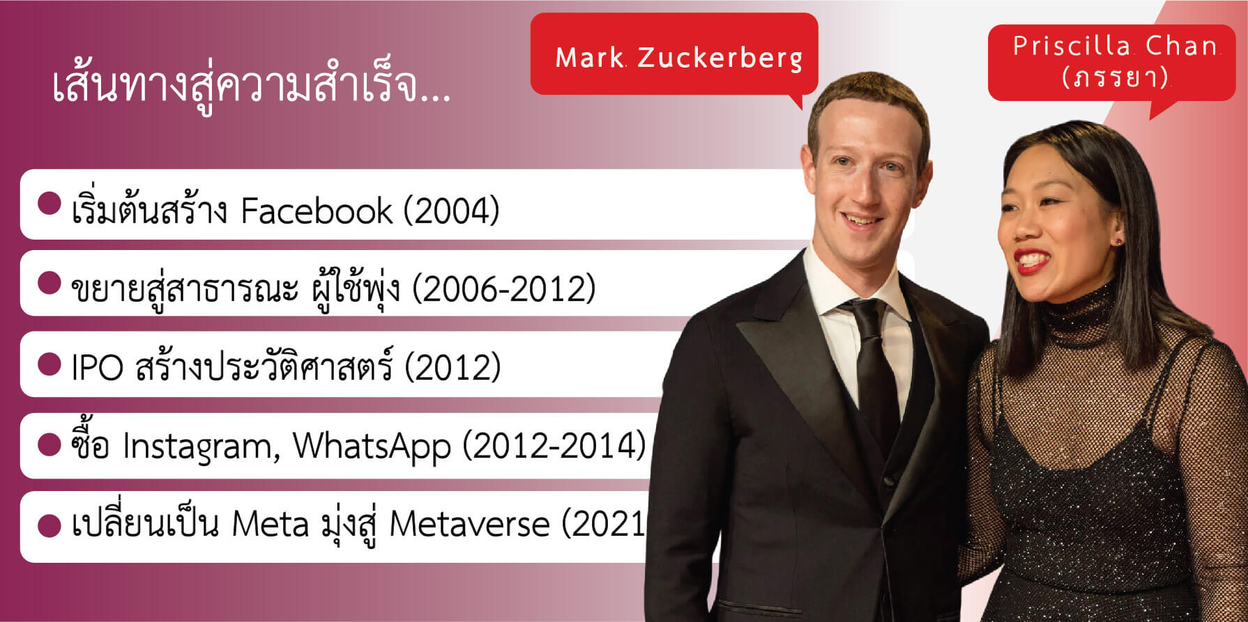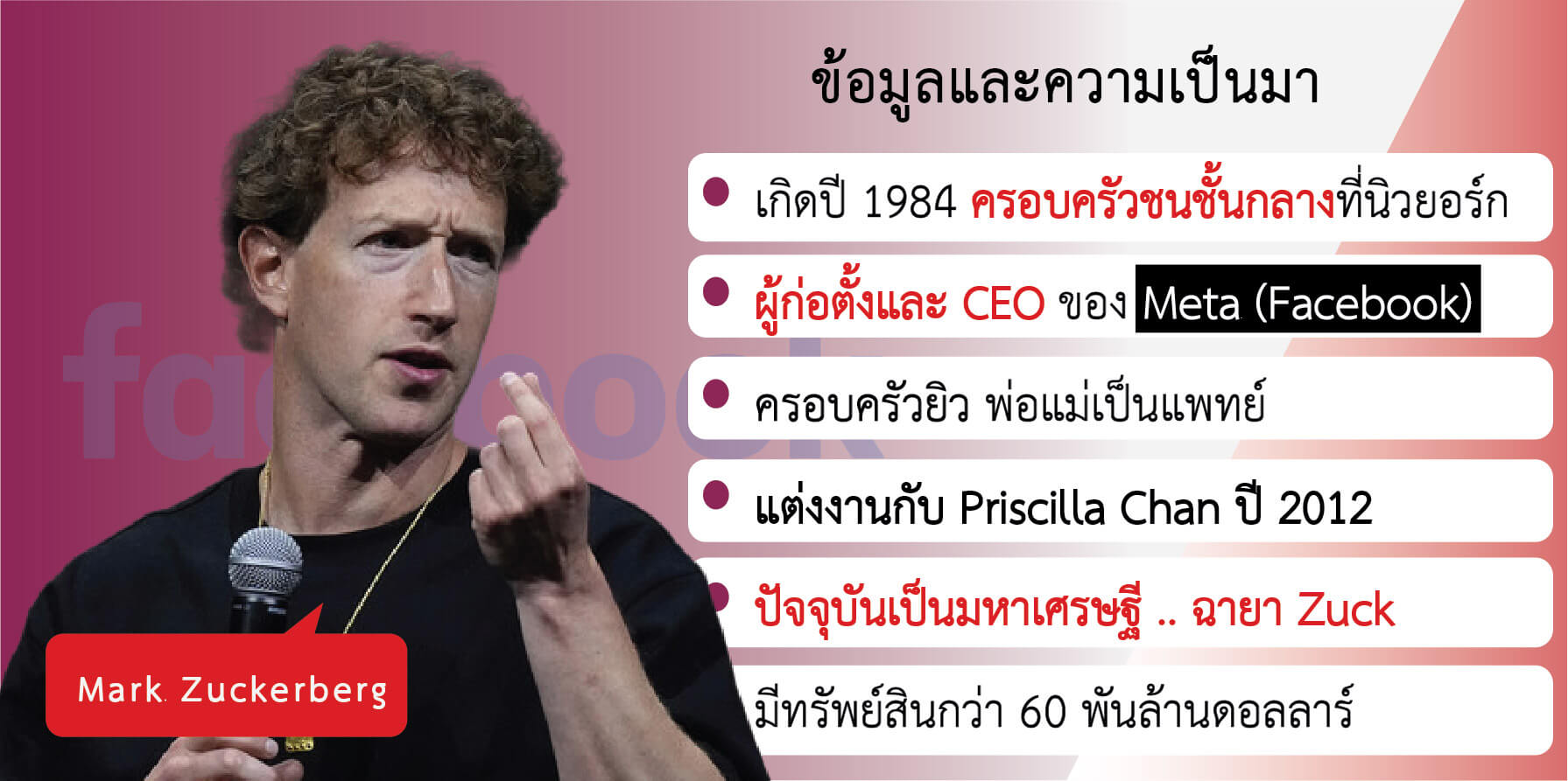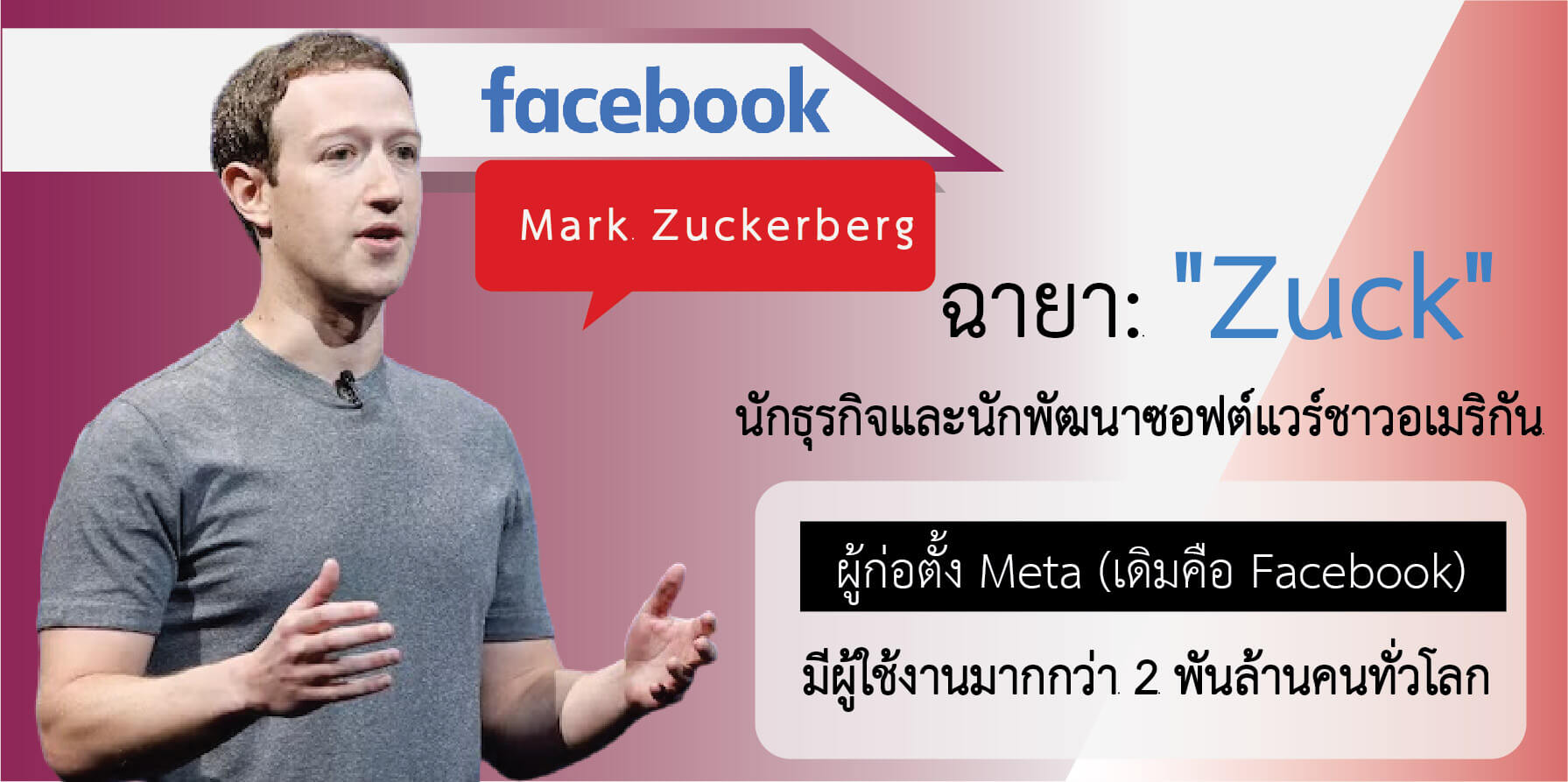 - ตำแหน่ง: ผู้ร่วมก่อตั้ง ประธาน และ CEO ของ Meta Platforms (เดิมคือ Facebook, Inc.)