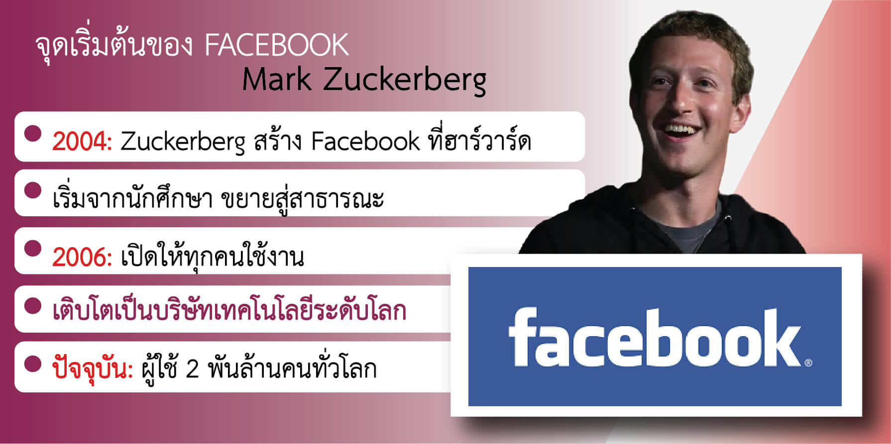 - ก่อตั้ง Facebook ในปี 2004 และพัฒนาจนกลายเป็นแพลตฟอร์มโซเชียลมีเดียที่ใหญ่ที่สุดในโลก