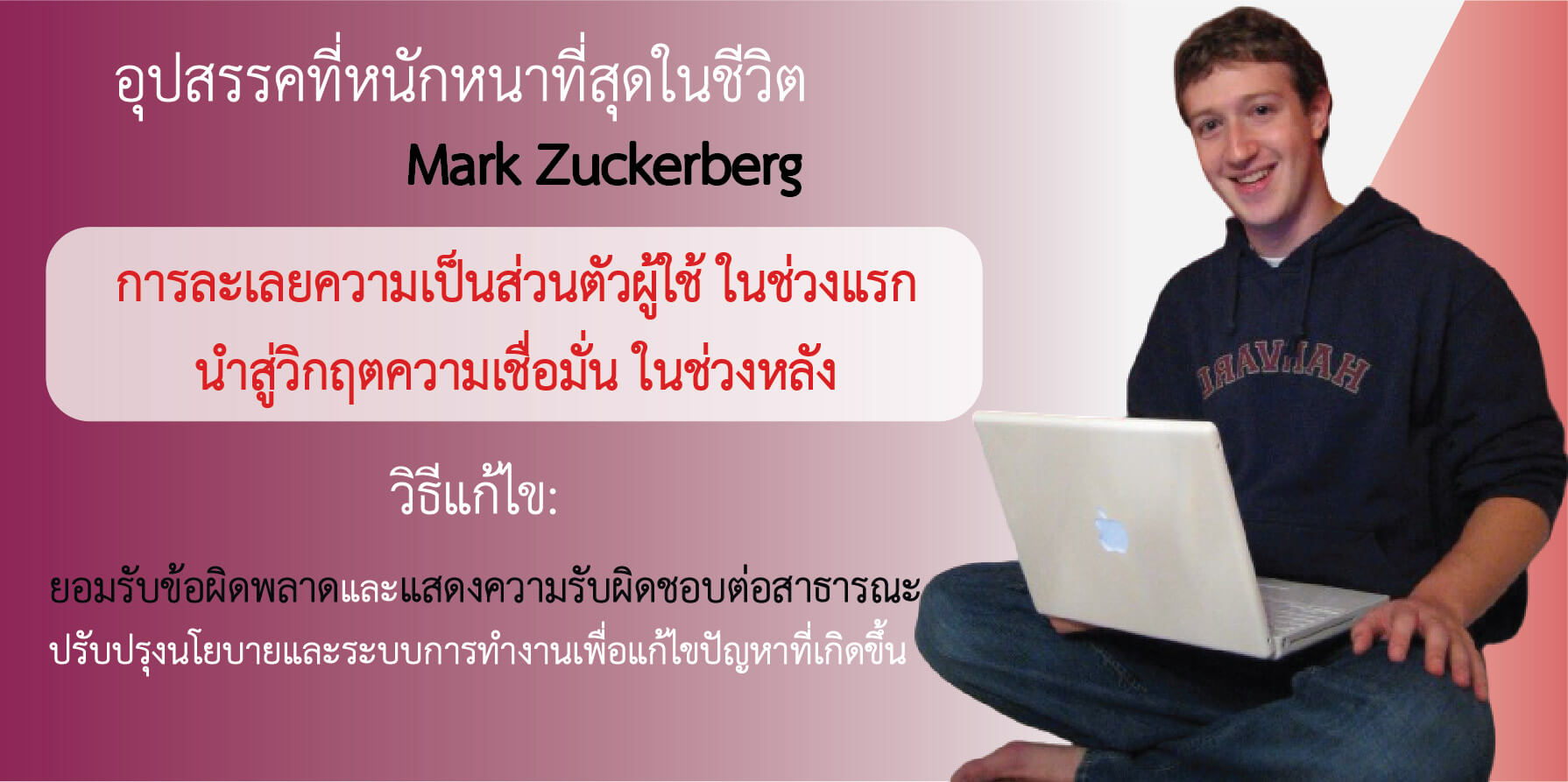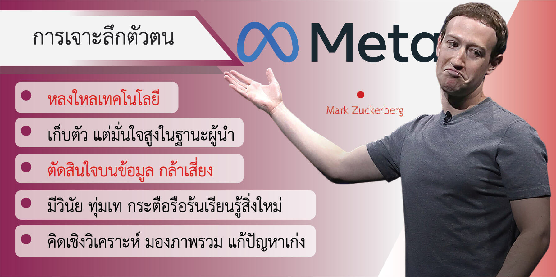 เรื่องราวของ Mark Zuckerberg น่าสนใจเพราะแสดงให้เห็นถึงพลังของความคิดสร้างสรรค์และนวัตกรรมที่สามารถเปลี่ยนแปลงโลกได้ จากนักศึกษามหาวิทยาลัยธรรมดา เขาสามารถสร้างธุรกิจที่มีมูลค่าหลายแสนล้านดอลลาร์ และมีอิทธิพลต่อวิถีชีวิตของผู้คนทั่วโลก การศึกษาเรื่องราวของเขาจะช่วยให้เราเข้าใจถึงวิธีคิด กลยุทธ์ และวิสัยทัศน์ที่อยู่เบื้องหลังความสำเร็จอันยิ่งใหญ่นี้ รวมถึงผลกระทบของเทคโนโลยีต่อสังคมในยุคดิจิทัล