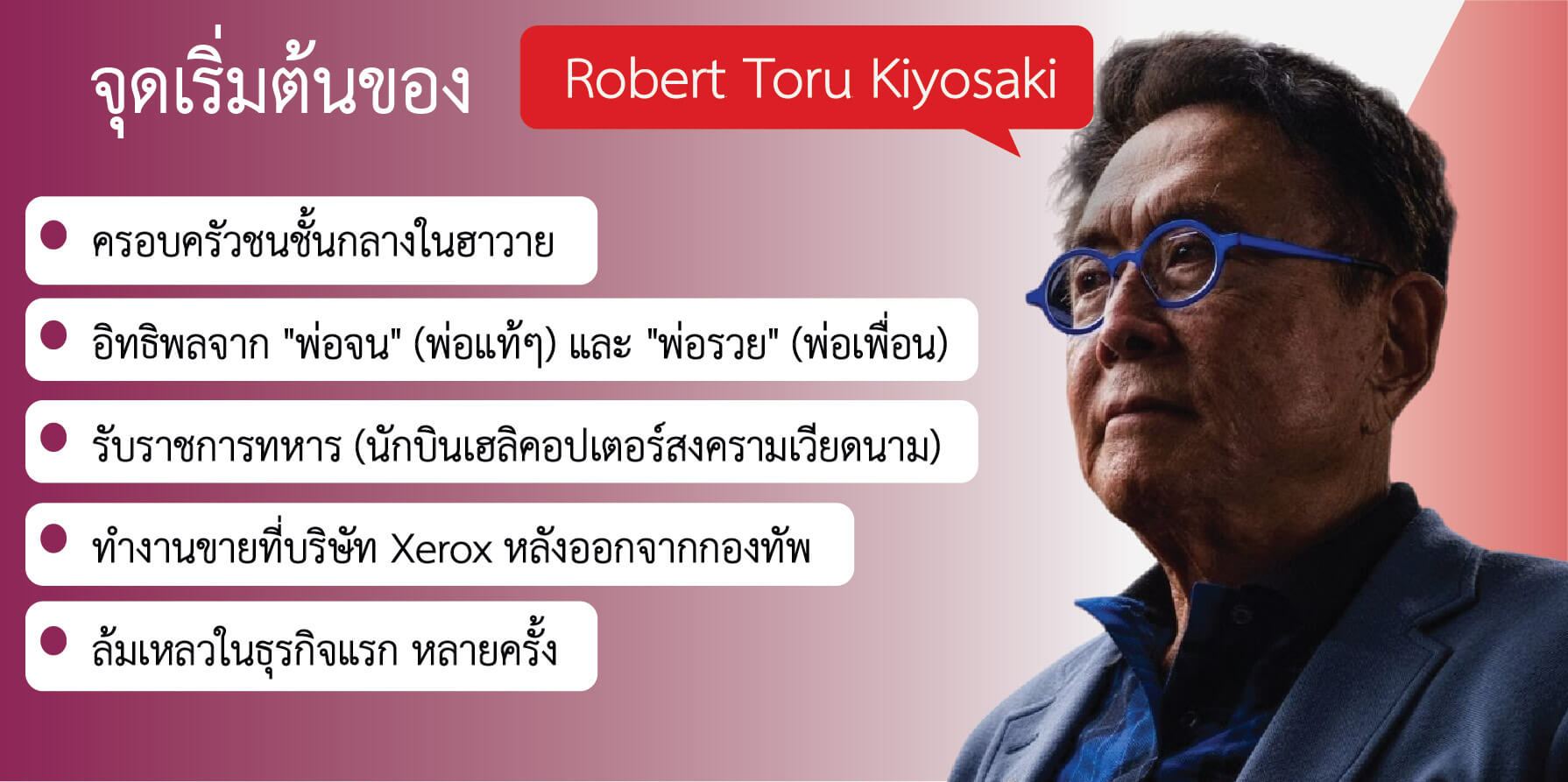 จุดเริ่มต้นของ Robert Toru Kiyosaki เป็นเรื่องราวที่น่าสนใจและสร้างแรงบันดาลใจ แสดงให้เห็นถึงการหล่อหลอมประสบการณ์ชีวิตที่นำไปสู่ความสำเร็จในภายหลัง เกิดในครอบครัวชนชั้นกลางในฮาวาย คิโยซากิได้รับอิทธิพลจากพ่อของตนเองและ “พ่อรวย” ซึ่งเป็นพ่อของเพื่อน ทำให้เขาได้เห็นมุมมองที่แตกต่างเกี่ยวกับเงินและความสำเร็จ การศึกษา ประสบการณ์ทางทหาร และการทำงานในช่วงต้นของชีวิตได้วางรากฐานสำหรับแนวคิดทางการเงินที่เป็นเอกลักษณ์ของเขา