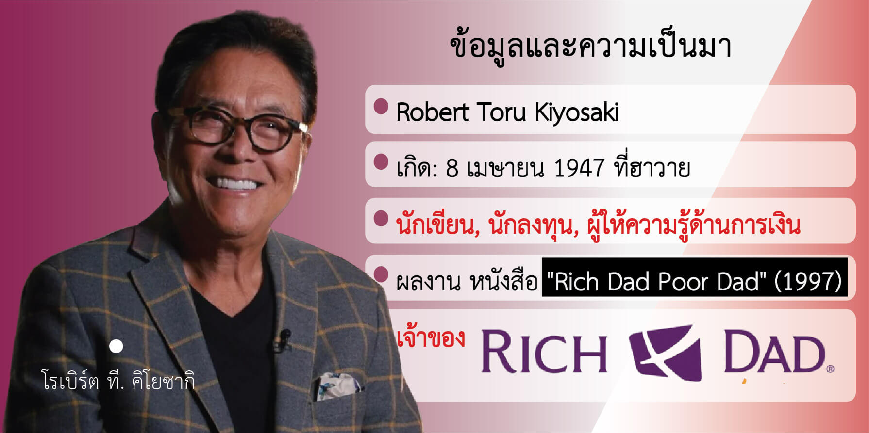โรเบิร์ต ทอรุ คิโยซากิ (Robert Toru Kiyosaki) เป็นนักเขียนผู้สร้างแรงบันดาลใจและกูรูด้านการเงินผู้โด่งดังเป็นนักธุรกิจชาวอเมริกัน นักลงทุน นักเขียน และนักพูดสร้างแรงบันดาลใจ ที่รู้จักกันดีในฐานะผู้เขียนหนังสือขายดี “Rich Dad Poor Dad” (พ่อรวยสอนลูก) เขาได้รับการยอมรับอย่างกว้างขวางว่าเป็นผู้เชี่ยวชาญด้านการศึกษาทางการเงินและการลงทุน โดยมีฉายาว่า “พ่อรวย” ตามชื่อหนังสือที่โด่งดังของเขา