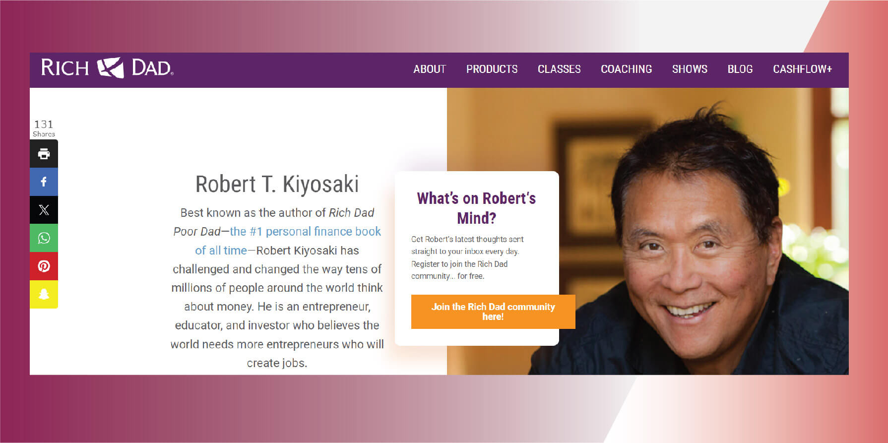 เรื่องราวของโรเบิร์ต คิโยซากิ น่าสนใจเพราะเขาได้ท้าทายแนวคิดการเงินแบบดั้งเดิมและนำเสนอมุมมองใหม่เกี่ยวกับความมั่งคั่งและความสำเร็จทางการเงิน ผู้อ่านควรอ่านต่อเพื่อเรียนรู้ว่าคิโยซากิได้เปลี่ยนแปลงวิธีคิดของผู้คนนับล้านเกี่ยวกับเงินและการลงทุนอย่างไร รวมถึงแนวคิดที่ขัดแย้งของเขาเกี่ยวกับการศึกษา การทำงาน และการสร้างความมั่งคั่ง