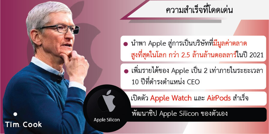 • นำพา Apple เติบโตจนมีมูลค่าตลาดสูงที่สุดในโลก กว่า 2.5 ล้านล้านดอลลาร์ในปี 2021